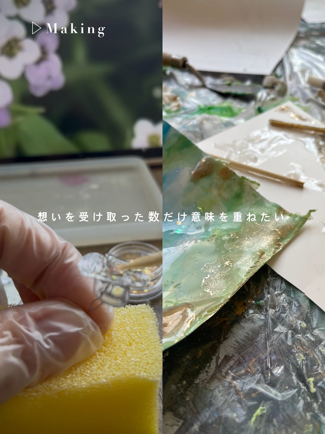 ・レジン素材は経年により少しずつ風合いが変化します。その時間の重なりも含めてお楽しみいただけたら嬉しいです